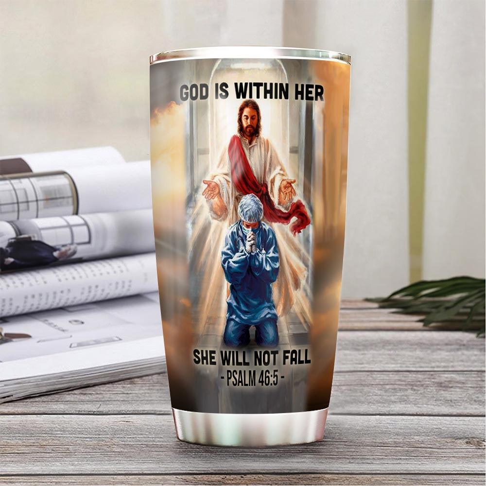 Personalized 20oz Nurse Tumbler God Is Within Her She Will Not Fall Bible Emergency Numbers